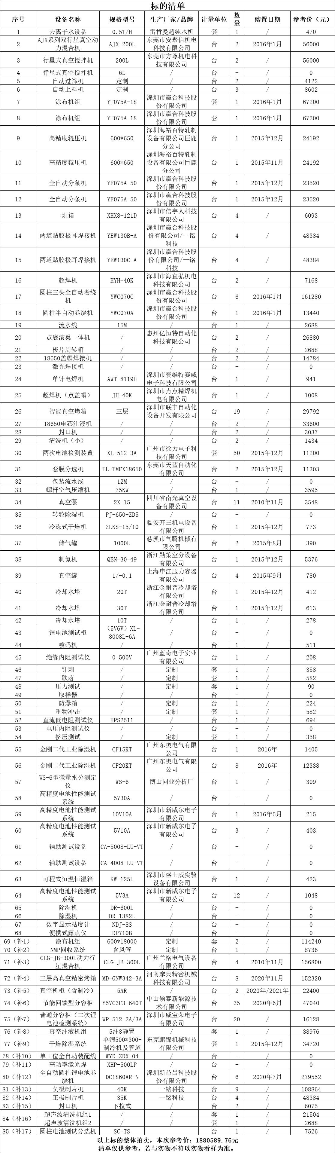 一、拍賣標的:全自動圓柱鋰電池卷繞機、正負制片機、AJX系列雙行星真空動力混合機、圓柱三頭全自動卷繞機、行星式真空攪拌機、涂布機組等二手設(shè)備一批,整體拍賣,參考價:1880589.76元。競買保證金:20萬元。
