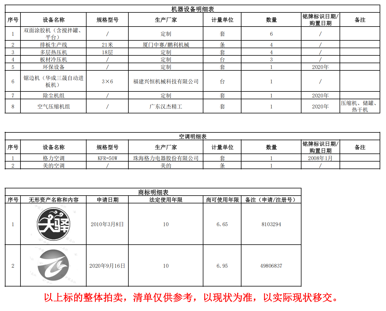 一、拍賣標(biāo)的:六安市葉集區(qū)天億木業(yè)有限責(zé)任公司位于葉集綠色板材工業(yè)園的機(jī)器設(shè)備一批、空調(diào)兩臺、商標(biāo)兩項,參考價:26.195萬元。標(biāo)的物以現(xiàn)狀為準(zhǔn),以實(shí)際現(xiàn)狀移交。標(biāo)的明細(xì)見下方: