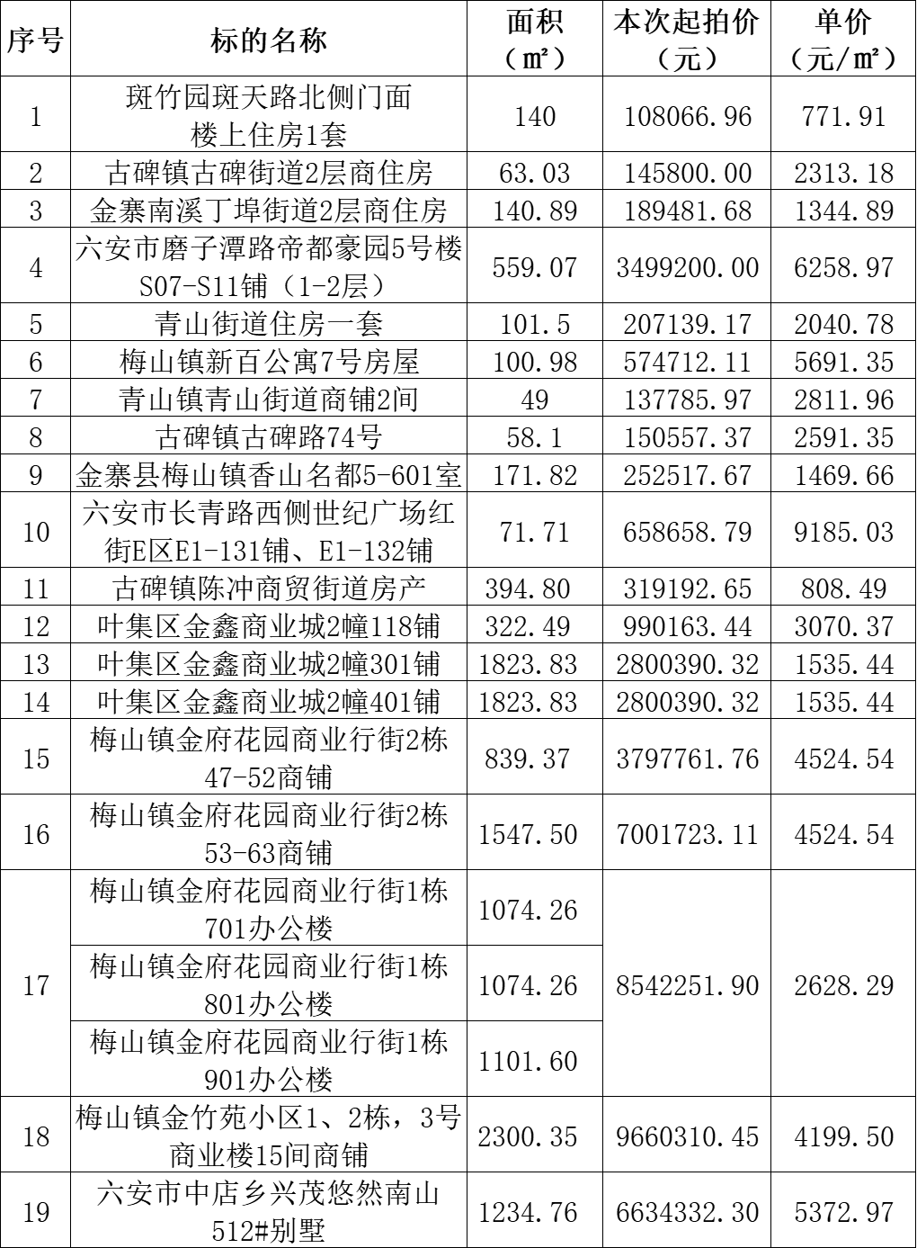 六安市磨子潭路帝都豪園商鋪、古碑鎮(zhèn)古碑街道商住房、葉集區(qū)金鑫商業(yè)城商鋪、梅山鎮(zhèn)金府花園商業(yè)行街辦公樓、六安興茂悠然南山別墅等19處房產,最低單價771.91元/㎡。標的詳情見下方所附清單: