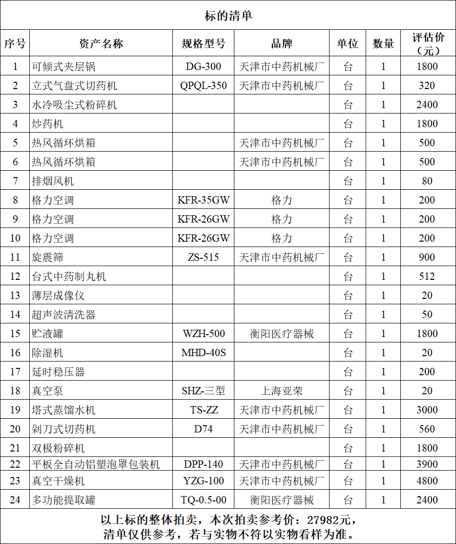 一、拍賣標(biāo)的:六安市中醫(yī)院制劑室報(bào)廢設(shè)備一批,包括組合空調(diào)箱、真空干燥機(jī)、平板全自動(dòng)鋁塑泡罩包裝機(jī)、風(fēng)冷模板等,參考價(jià):27982元,競(jìng)買保證金:5000元。