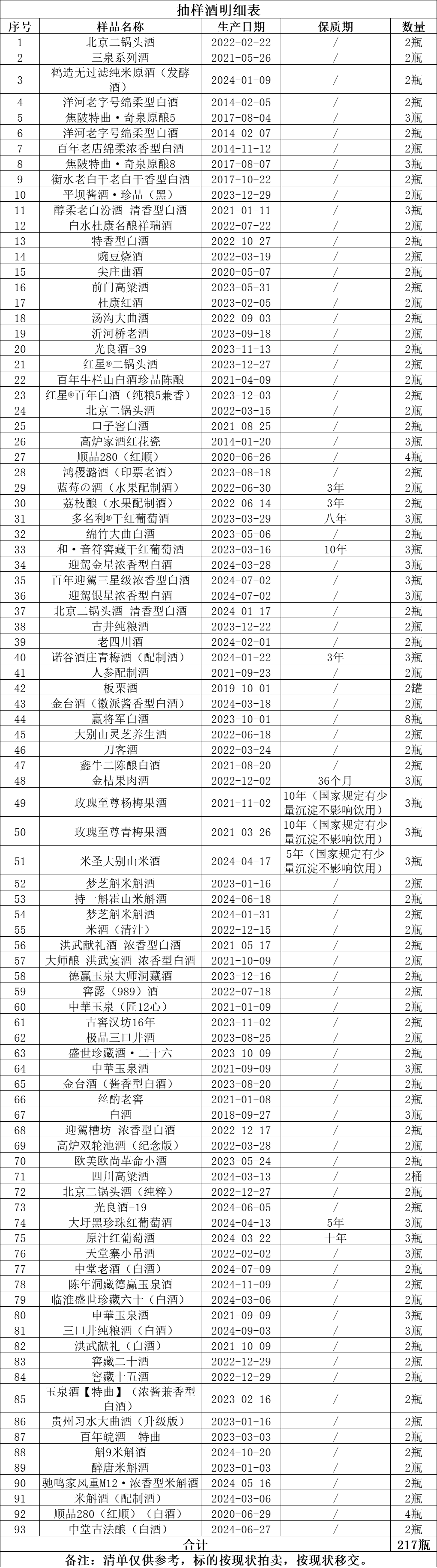 一、拍賣(mài)標(biāo)的:洋河老字號(hào)綿柔型白酒、金臺(tái)酒、高爐家酒、迎駕金星、米斛酒等抽樣酒共計(jì)217瓶。整體打包拍賣(mài),參考價(jià):1958元。競(jìng)買(mǎi)保證金:2000元。