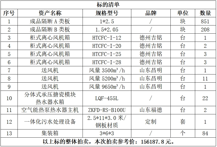一、拍賣標(biāo)的:六安市中醫(yī)院設(shè)施設(shè)備一批,包括:集裝箱、一體化污水處理設(shè)備、柜式離心風(fēng)機(jī)箱、送風(fēng)機(jī)等,參考價:156187.8元,競買保證金:2萬元。