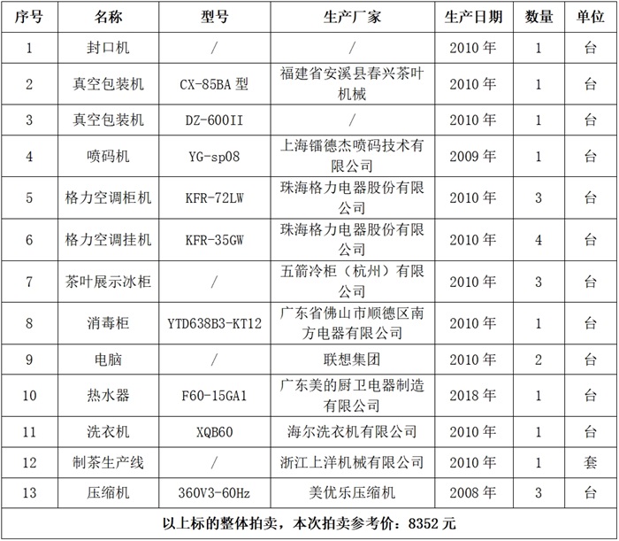 一、拍賣標的:制茶生產(chǎn)線、壓縮機等報廢生產(chǎn)設(shè)備及空調(diào)等廢舊物資一批,打包拍賣,參考價:8352元,競買保證金:3000元。