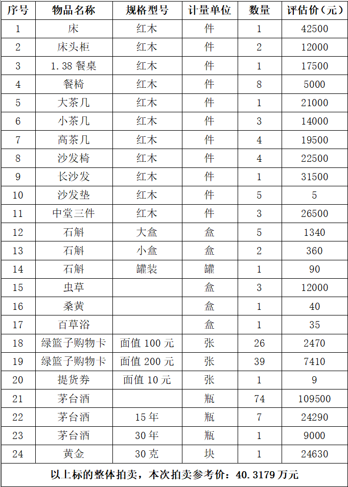 一、拍賣標(biāo)的:茅臺(tái)酒、黃金、家具等物品一批,整體打包拍賣,參考價(jià):40.3179萬元。競(jìng)買保證金:8萬元。詳見下方明細(xì)表: