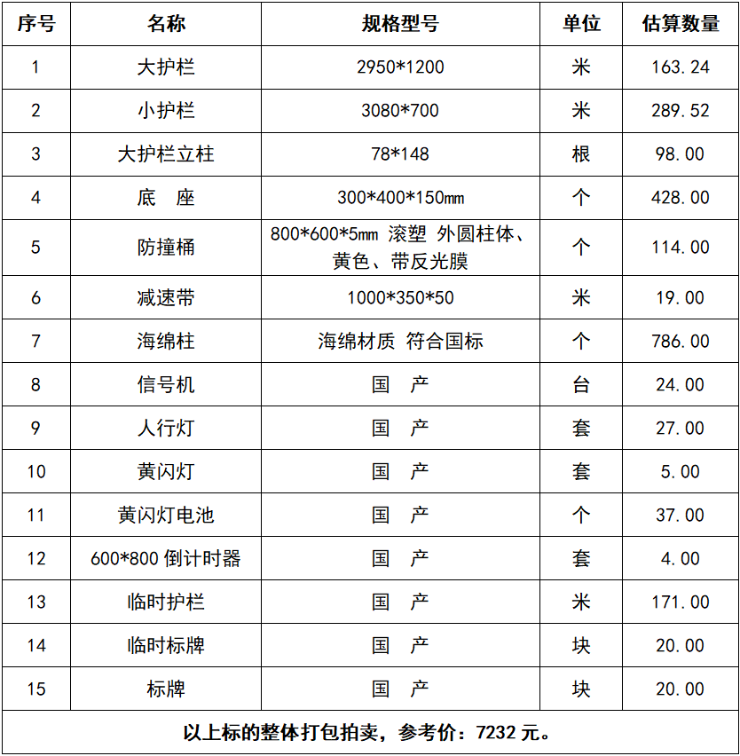 一、拍賣標的:廢舊物資一批,包括護欄、防撞桶、黃閃燈電池等,參考價:7232元。