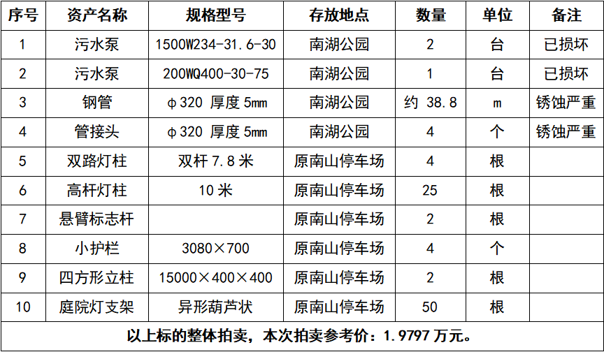 1、廢舊設(shè)備耗材一批,包括污水泵、鋼管、高桿燈柱、懸臂標(biāo)志桿、四方形立柱等,參考價(jià):1.9797萬元,競(jìng)買保證金:1萬元。