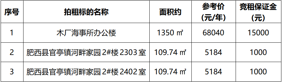 一、拍租標(biāo)的:六安市金安區(qū)木廠海事所辦公樓及肥西縣官亭鎮(zhèn)河畔家園2#樓2303室、2402室房屋3年期租賃權(quán),拍租詳情見(jiàn)下表: