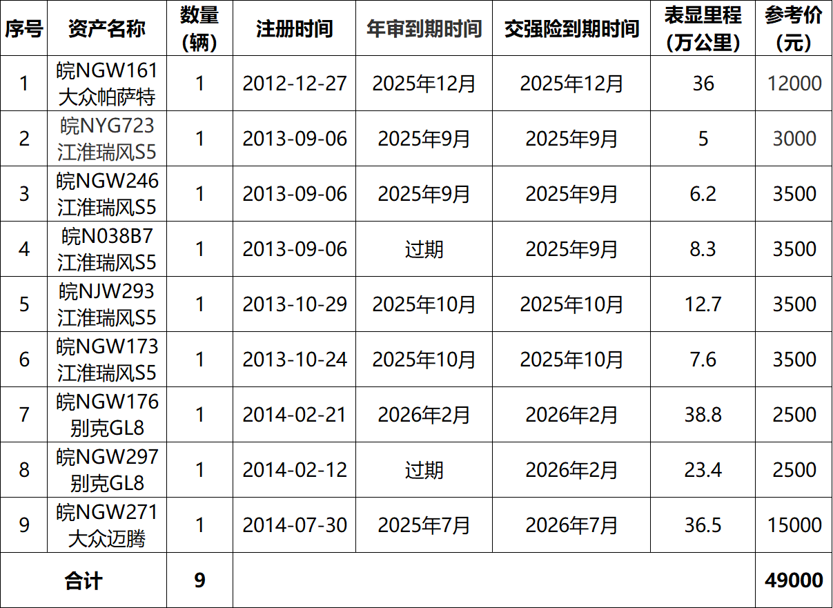 一、拍賣標的:皖NGW161大眾帕薩特、皖NYG723江淮瑞風等二手車9輛,整體打包拍賣,整體參考價:4.9萬元。競買保證金:1萬元。標的詳情見下方清單: