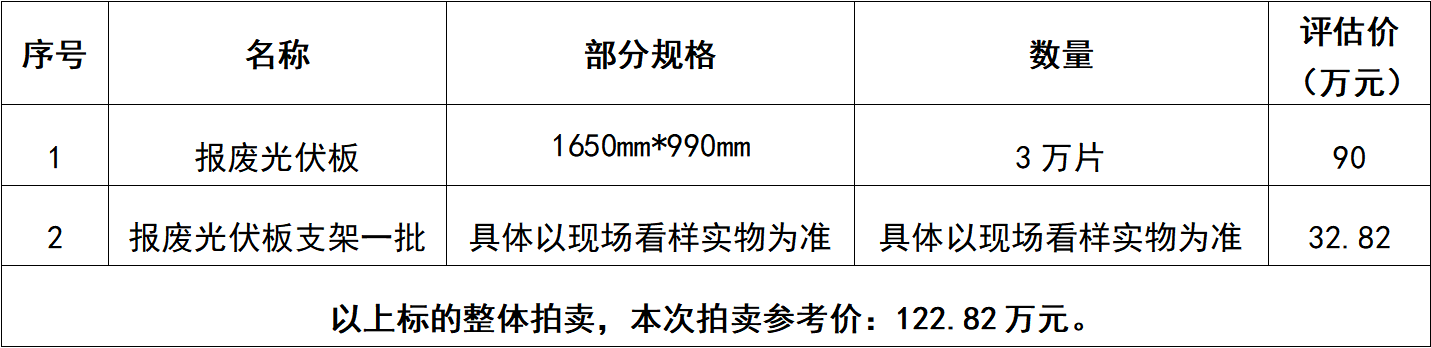 一、拍賣標(biāo)的:報(bào)廢光伏板3萬(wàn)片及報(bào)廢光伏板支架一批(具體以現(xiàn)場(chǎng)看樣實(shí)物為準(zhǔn)),整體拍賣,參考價(jià):122.82萬(wàn)元。競(jìng)買保證金:15萬(wàn)元。